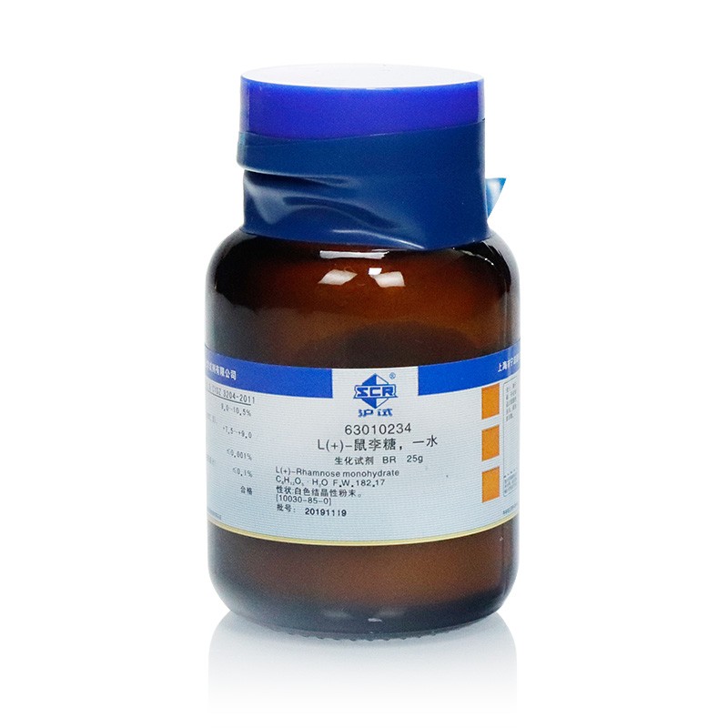 鼠李糖,又称6-脱氧-L-甘露糖,是广泛存在于植物的多糖、糖苷、植物胶和细菌多糖中的一种物质。无色结晶性粉末,有α-型和β-型两种互变异构体。Α-型为单斜柱状结晶,常含一分子结晶水。无气味。味极甜。加热失去结晶水而部分变成β-型。水中溶解度为0.1G/ml。溶于甲醇,微溶于乙醇。相对密度 (d204)1.4708。熔点 82~92℃。在0.27kPA时,105℃能升华。有变旋性,比旋光度 [α]20D-7.7°→+8.9°。Β-型为针状结晶。易吸湿,能在湿空气中变成α-型结晶。熔点 122~126℃(速热)。比旋光度 [α]20D+31.5°(1分钟,c=10),短时间后,变旋到+8.9°。