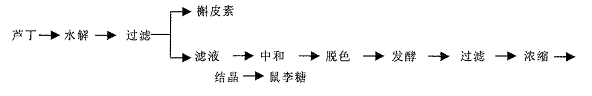 芦丁在稀H2S04中水解可以得到鼠李糖和葡萄糖的混合物以及榭皮素。据文献报道,曾用结晶法从其水解液里提取鼠李糖。但结晶法难度较大,因为葡萄糖和鼠李糖各占50%,混合物的粘度相当高,要想让鼠李糖从混合物中结晶出来相当困难;即使结晶出来,鼠李糖的纯度也不高,只能达到95%左右。而下面介绍的发酵法利用酵母对葡萄糖的特异降解能力,先降解葡萄糖,再结晶鼠李糖,这样操作简单易行,可克服结晶法的缺点,将鼠李糖的纯度提高到99%以上,适宜于大规模生产。