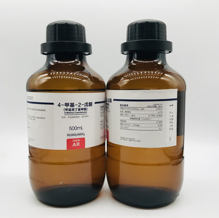甲基异丁基甲酮又称4-甲基-2-戊酮呈无色液体。有芳香酮和樟脑气味。能与乙醇、苯、乙醚和多数有机溶剂混溶,微溶于水(1.9%)。相对密度(d204)0.801。熔点-84.7℃。沸点117~118℃。折光率(n20D)1.396。闪点23℃。易燃。蒸气能与空气形成爆炸性混合物,爆炸极限1.3%~8.0%(体积),蒸气刺激眼睛和呼吸道。。低毒,半数致死量(大鼠,经口)2080mg/kg。是一种优良的中沸点溶剂及分离剂。