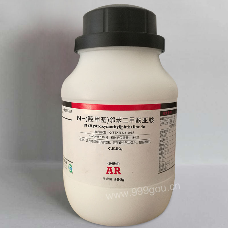 中文名称 N-羟甲基邻苯二甲酰亚胺;N-(羟甲基)邻苯二甲酰亚胺;N-羟甲基酞酰亚胺英文名称 N-(Hydroxymethyl)phthalimide;N-(Hydroxymethyl)phthalimide;Phthalimidomethanol分子式 C9H7NO3分子量 177.16CAS号 118-29-6危险性质 非危险化学品质检信息质检项目 指标值含量,% ≥98.0%PSA:57.61000LOGP:0.17030化学特性N-羟甲基邻苯二甲酰亚胺为白色结晶性粉末,熔点142-145℃。难溶于一般有机溶剂。产品用途1.N-(羟甲基)邻苯二甲酰亚胺可用于生产杀虫剂亚胺硫磷。2.N-(羟甲基)邻苯二甲酰亚胺可用于农药、染料、颜料、医药的有机合成。3.N-(羟甲基)邻苯二甲酰亚胺可用于芳香烃在三氟甲磺酸中的酰胺甲基化反应。生产方法1.由邻苯二甲酰亚胺与甲醛反应而得。将甲醛加入反应锅,加水将甲醛配成12%左右的浓度。搅拌下投入邻苯二甲酰亚胺,用量为邻苯二甲酰亚胺:甲醛=1:1.1(摩尔比)。升温至98-102℃,回流反应2.5h,降温至35℃,离心过滤,烘干而得成品。2.1.用水为溶剂的制法〔1〕. 将从100克邻苯二甲酸酥制得的邻苯二甲酷亚胺研成细粉,悬浮在80毫升40%甲醛中,加入200毫升水,加热至103-108℃ }回流4小时。当全部邻苯二甲酸亚胺都溶解时,反应即告完成。如果需要则趁热过滤,让滤液冷却,N一经甲基邻苯二甲酞亚胺成为无色闪光片状晶体析出。3..用乙醇为溶剂的制法 3克(0.0204摩尔)邻苯二甲酞亚胺悬浮于35毫升沸腾的80%乙醇中。加入2毫升37%甲醛榕液,回流直到邻苯二甲酰亚胺完全溶解。蒸去大部分乙醇,即析出产物晶体,在水中或苯中重结晶。