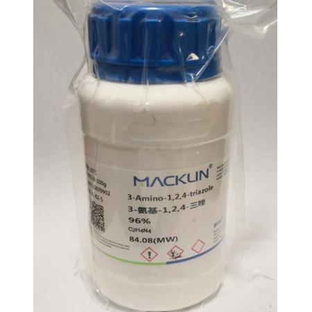 中文名称 3-氨基-1H-1,2,4-三氮唑;3-氨基-1H-1,2,4-三唑;3-氨基-1,2,4-三氮茂;3-氨基-1,2,4-三唑;-氨基-1,2,4-三氮杂茂;杀草强;3-AT英文名称 3-Amino-1H-1,2,4-triazole;3-Amino-1H-1,2,4-triazole;3-Amino-1,2,4-Triazole;Amitrole;Amitrol;Aminotriazole;3-AT分子式 C2H4N4分子量 84.08CAS号 61-82-5危险性质 非危险化学品质检信息质检项目 指标值含量,% ≥96.0%PSA: 56.73000LOGP: -0.42690化学特性3-氨基-1,2,4-三唑是一种白色结晶性粉末。溶于水、甲醇、乙醇及氯仿,不溶于乙醚及丙酮。密度1.138沸点244.9ºC at 760 mmHg熔点150-153 °C(lit.)闪点101.9ºC折射率1.739水溶解性280 g/L (20 ºC)。