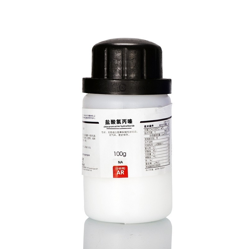 盐酸氯丙嗪是一种白色或乳白色结晶性粉末,有吸湿性,微臭,味极苦。1g溶于2.5ml水,溶于甲醇、乙醇和氯仿,几乎不溶于乙醚和苯。5%水溶液pH 4.0~5.5。179~180℃分解。中等毒,半数致死量(大鼠,经口)225mg/kg。本品易氧化,在空气或日光中渐变为红棕色。