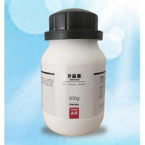 化学特性升麻素为白色结晶粉末。升麻为毛茛科植物大三叶升麻Cimicifugaheracleifoliakom.兴安升麻Cimicifugadahurica(Turcz.)Maxim.和升麻CimicifugafoetidaL.的根茎,又名周升麻、周麻、鸡骨升麻、鬼脸升麻等,生于林下、山坡草丛及溪沟旁,主产于陕西、四川、青海、云南、河南等地。升麻中的主要成分为三萜多氧化合物及色原酮、酚酸、多种色酮、齿阿米醇及齿阿米素等。其中已鉴定结构的有:异阿魏酸(Isoferulicacid),3-乙酰氨基咖啡酸(3-Acetylcaffeicacid),咖啡酸葡萄糖酯甙(Caffeicesterglucoside),升麻素(Cimifugin),升麻素葡萄糖甙(Cimifuginglucoside),6-异次黄嘌呤核苷(6-Isoinosine),北升麻瑞(Cimidahurine),北升麻宁(Cimidahurinie),D-葡萄糖(D-glucose),庶糖(Sucrose)等。升麻属含特有的四环三萜升麻吉醇(cimigenol)的衍生物和呋喃色酮类化合物(升麻素cimicifugin等),有祛风解热、发表解毒等作用。
