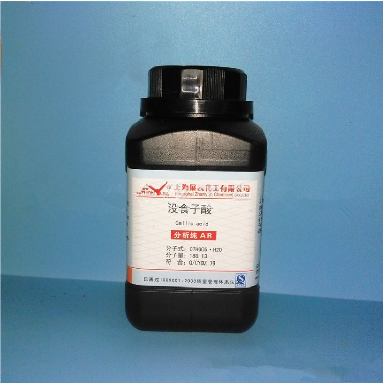 没食子酸亦称五倍子酸或棓酸,是一种有机酸,可见于五倍子、金缕梅、漆树、橡树皮、茶叶中。为白色结晶粉末,无气味。微有酸味。遇光变成棕褐色。热至 100~120℃失去结晶水。有收敛性。1G溶于87ml水、3ml沸水、6ml乙醇、100ml乙醚、10ml甘油、5ml丙酮,几乎不溶于苯、氯仿和石油醚。相对密度1.694。熔点235~240℃(分解)。没食子酸易溶于水、醇和醚;具有酚(易被氧化和三氯化铁水溶液生成蓝黑色沉淀)及羧酸(加热时失去二氧化碳成焦性没食子酸)的性质。 半数致死量(兔,经口)5G/kG。有刺激性。