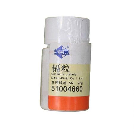 镉粒为稀有金属元素,属于元素周期表的第12组(以前为IIB);第 48号位。元素的名称是从炉甘石的古名碳酸锌ZnCO3衍生而来的,银白色有光泽软质金属;有棒、片、丝、颗粒、粉等。质软,有延展性,在空气中表面被氧化,而内部不被侵蚀;80℃时变脆燃烧;18℃时100g汞溶解5.17g镉;镉盐溶液遇硫化氢或硫化钠产生沉淀。易溶于稀硝酸,慢溶于热盐酸,与碱溶液无反应,不溶于水,能被热硫酸转化为硫酸盐。可溶性18℃时100g汞溶解5.17g镉;易溶于稀硝酸,慢溶于热盐酸,与碱溶液无反应,不溶于水。熔点321℃沸点765℃密度8.65银白色带蓝色光泽的金属。质软,有延展性,在空气中表面被氧化,而内部不被侵蚀。80℃时变脆燃烧。能被热硫酸转化为硫酸盐。镉盐溶液遇硫化氢或硫化钠产生沉淀。镉在潮湿空气中缓慢氧化并失去金属光泽,加热时表面形成棕色的氧化物层,若加热至沸点以上,则会产生氧化镉烟雾。高温下镉与卤素反应激烈,形成卤化镉。也可与硫直接化合,生成硫化镉。镉可溶于酸,但不溶于碱。镉的氧化态为+1、+2。氧化镉和氢氧化镉的溶解度都很小,它们溶于酸,但不溶于碱。镉可形成多种配离子,如Cd(NH3)、Cd(CN)、CdCl等。
