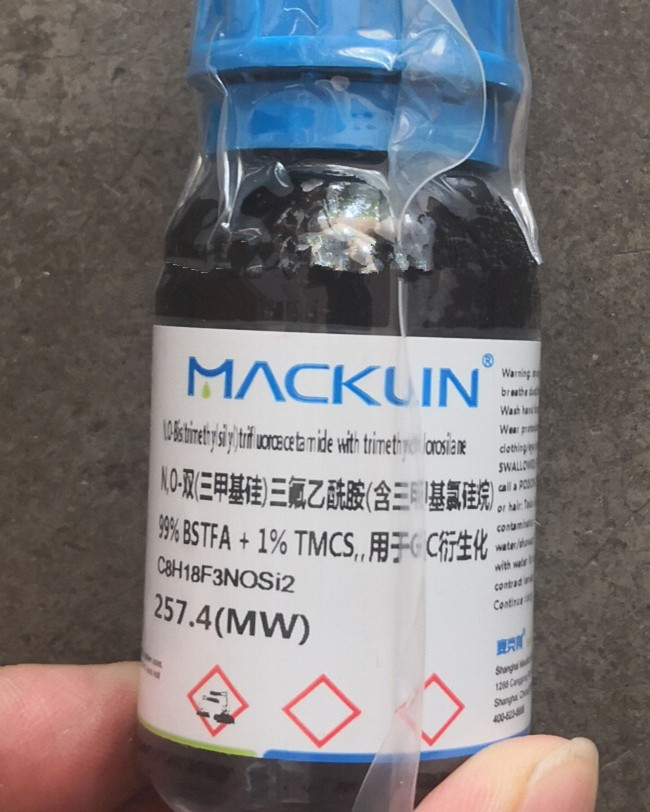 质检信息质检项目 指标值灼烧残渣(以硫酸盐计),% ≤0.01含量,% ≥98.0%PSA: 21.59000LOGP: 3.63360规格 25毫升此品为(不含三甲基氯硅烷) 。N,O-双(三甲基硅)三氟乙酰胺(含三甲基氯硅烷),99% BSTFA + 1% TMCS,,用于GC衍生化 价格5ml 170元化学特性N,O-双(三甲基硅)三氟乙酰胺是一种化学物质,透明至淡黄色透明液体;密度0.97 g/mL(lit.)沸点45-50 °C14 mm Hg(lit.)熔点-10°C闪点75 °C折射率n20/D 1.384(lit.)蒸汽压0.193mmHg at 25°C对湿敏感。遇水分解。易燃,具腐蚀性和刺激性。对水体有危害。