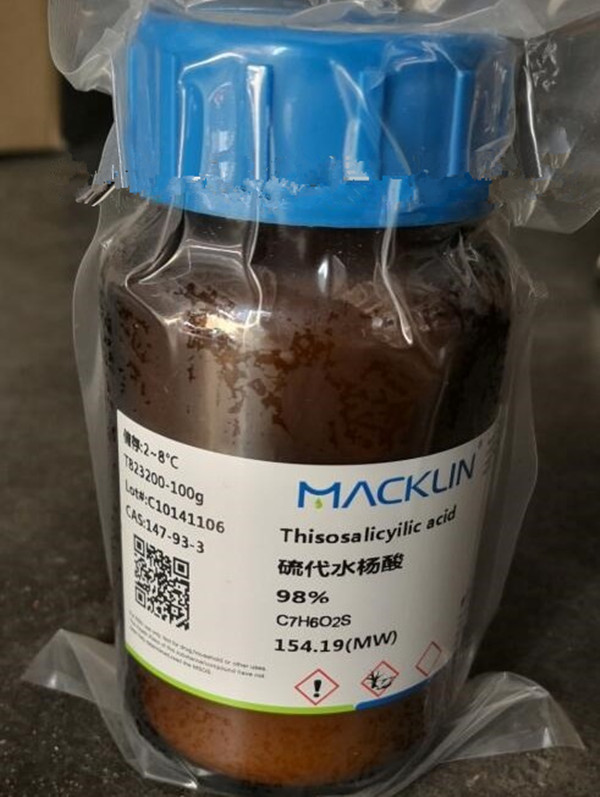 产品用途硫代水杨酸用作硫柳汞的中间体,也是硫靛蓝色染料中间体,铁测定试剂。用作有机合成、医药和染料中间体。分析试剂,测定铁;液相色谱测定乙基汞硫代水杨酸钠和乙基汞;化学合成,硫靛染料制备。