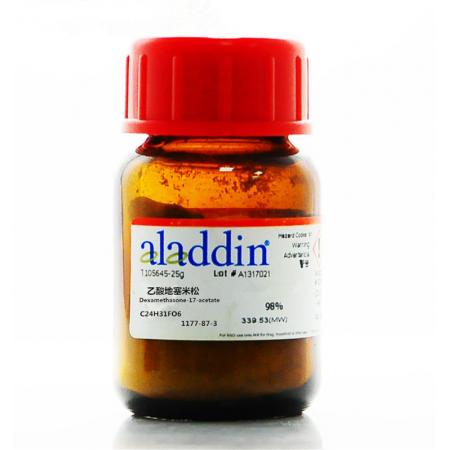 化学特性醋酸地塞米松为白色结晶粉末,无气味,味淡苦,对光敏感。几乎不溶于水,溶于丙酮、二恶烷、乙醇、甲醇和氯仿,微溶于二氯甲烷。熔点 238-240℃。比旋光 [α]20/D+87±3º(c=1,1,4-Dioxane),具致敏性,可能对生育能力和胎儿造成伤害,对器官有危害。
