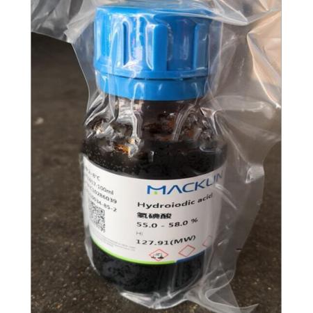氢碘酸又称碘化氢也是一种强酸化学物质,无色至黄色棕色液体,密度1.701沸点127ºC熔点133-135ºC折射率1.466 (16ºC),密度 ρ(25)1.50-1.55g/mL(47%H2O)、pH 1(13g/L,H2O,20℃)。有刺激性气味,对空气和光敏感。水溶液新鲜时为无色,在空气及光线下很快析出碘二转为黄色至棕色,有强烈的刺激性酸味,在空气中强烈发烟。混溶于水和乙醇。氢碘酸溶液解离度可达95%),碘化氢在有机溶剂中溶解度比在水中弱得多,表现为非电解质或弱电解质,在吡啶中的电离常数为3×10-3。空气中易分解为碘和氢。有强还原性,是氢卤酸中还原性最强者,可被Cl2、Br2、浓硫酸氧化游离出碘。常温下被空气氧化,能被浓硝酸、浓硫酸所氧化。与多数金属反应生成相应的碘化物和氢气。不燃,具腐蚀性。对水体有轻度危害。共沸混合物(56.9%HI);相对密度1.70。沸点127℃。商品氢碘酸分为三种:57%HI,相对密度1.70;47%HI,相对密度1.5;1%HI,相对密度1.1。加1.5%次磷酸使其脱色。临界温度150℃:临界压力8.3MPa。在-45℃时介电常数3.57。电导率8.5×10-10S·cm-1。汽化热19.76Kj/mol;熔化热2.87Kj/mol。易溶于水;溶于有机溶剂。2HI+2Cl2→HCl+ICl3