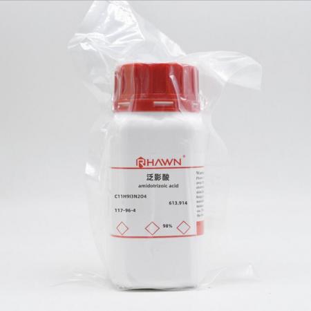 泛影酸是无色结晶性粉末,无臭,味微苦,不溶于水,微溶于乙醇,不溶于乙醚,溶于氢氧化钠溶液而生成钠盐。熔点>300ºC。沸点 614.1ºC 。密度2.619 。折射率 1.802。闪点 325.2ºC。