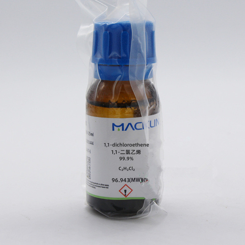 1,1-二氯乙烯是无色至淡黄色液体,有轻微氯仿气味,略有甜味,对空气、光和湿敏感。能迅速吸收氧形成爆炸性过氧化物。溶于乙醇、乙醚、苯和氯仿等有机溶剂,微溶于水。熔点 -122℃。沸点 30-32℃/760mmHg。密度 ρ(20)1.212-1.213g/mL。折光率 n20/D1.426。闪点 -13℉/-25℃。