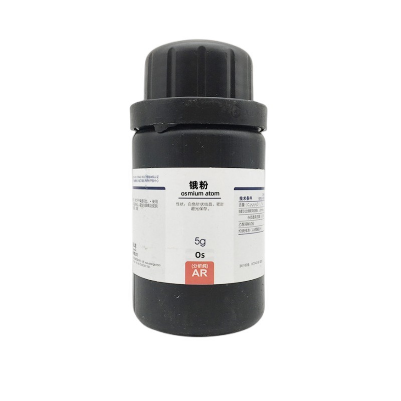 化合物二氧化锇:化学式为OsO2,有两种晶型(1)分子量222.20,为桔棕色晶体,相对密度11.37(21.4℃),加热到500℃时30%转化为四氧化锇。不溶于水和酸类;(2)分子量222.20,黑色粉末,相对密度7.71(21℃),加热至350~400℃转变成红棕色晶体。不溶于水,溶于稀盐酸。在氧中加热锇粉或由四氧化锇加热分解制得。四氧化锇:化学式为OsO4,分子量254.20,CAS号为20816-12-0,为白色或淡黄色结晶,有类似氯的气味,蒸汽压0.93kPa(20℃),熔点41.0℃,沸点130℃,微溶于水,溶于乙醇、乙醚、四氯化碳、氨水,密度为4.91g/cm3,主要用于催化剂、氧化剂、化学试剂,还用于医药和制造白热气灯的纱罩等。六氯合锇(Ⅲ)酸钠又名六氯锇酸钠,化学式为Na2[OsCl6],分子量为448.90,橙色斜方柱状晶体。溶于水、醇。向四氧化锇溶液中加入氯化钠及还原剂(如酒精)制得。二硫化锇:化学式为OsS2,分子量为254.33,为黑色立方晶体,受热分解,密度9.47g/cm3,不溶于水、碱类,溶于硝酸,由锇和硫加热直接化合而得。二碲化锇:化学式为OsTe2,分子量为443.40,为灰黑色晶体,熔点约600℃,不溶于酸,遇硝酸而分解。
