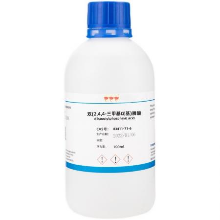化学特性双(2,4,4-三甲基戊基)膦酸又称二异辛基次膦酸是一种酸性次膦酸类萃取剂,为无气味的淡黄色液体,密度:0.93g/cm3沸点:269.9ºC at 760 mmHg闪点:117ºC折射率:1.502水果香味;弱酸性,无毒,对钢材及大部分塑料无腐蚀。