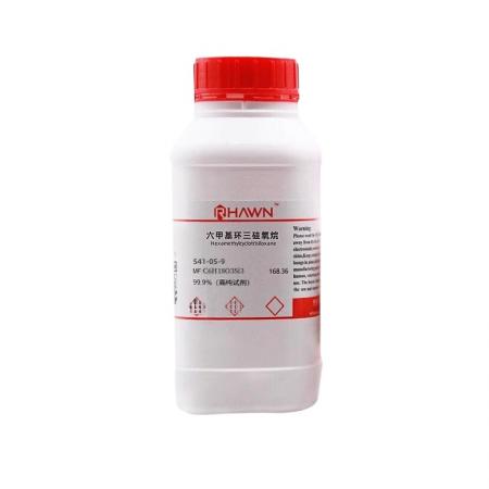 化学特性六甲基环三硅氧烷又称六甲基环三硅氮烷是一种化学物质,为无色至白色结晶粉末,密度:1.02沸点:134 °C(lit.)熔点:50-64 °C(lit.)闪点:95 °F折射率:1.417蒸汽密度:1 (vs air)对湿敏感。易燃。