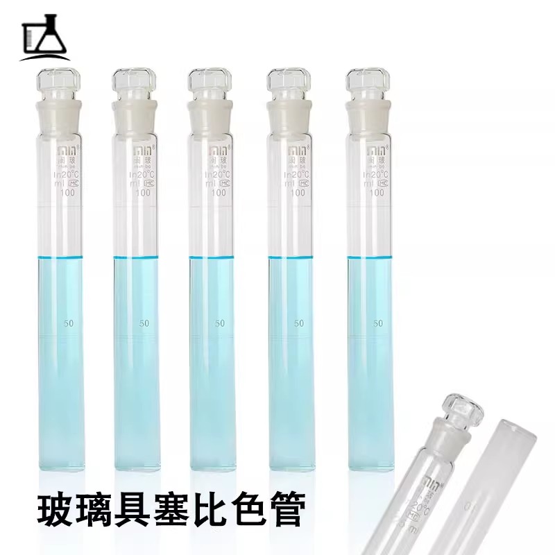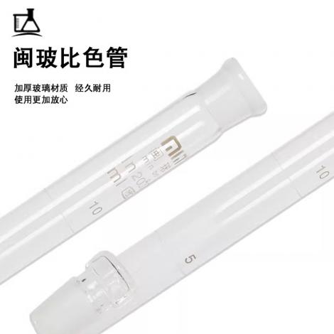 比色管是化学实验中用于目视比色分析实验的主要仪器,可用于粗略测量溶液浓度。比色时将装待测溶液的比色管与一支装标准溶液的比色管置于光照程度相同的白纸前面进行对比,用肉眼观察颜色差异。比色管的外型与普通试管相似但比试管多一条精确的刻度线并配有橡胶塞或玻璃塞,且管壁比普通试管薄,常见规格有10mL、25mL、50mL三种。