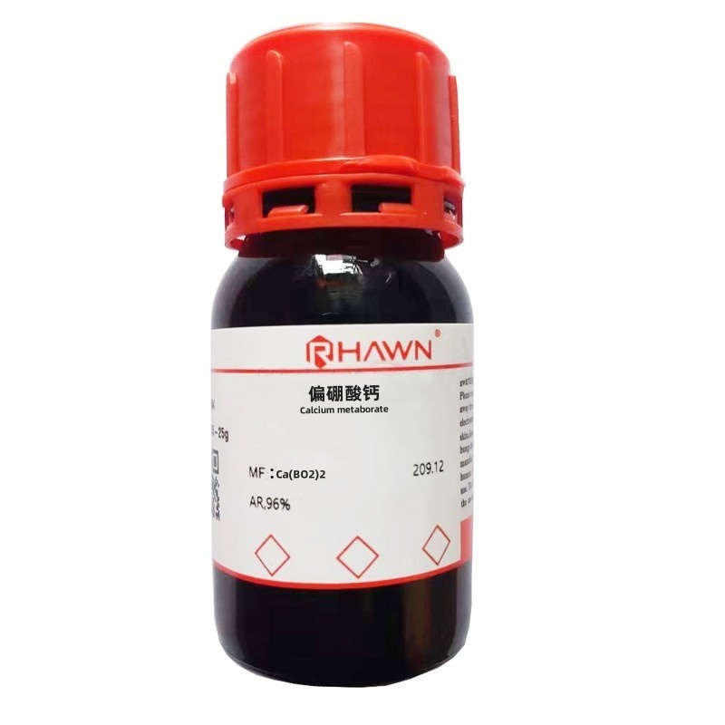 化学性质偏硼酸钙是一种无机化合物,为白色结晶,溶于酸和铵盐溶液,微溶于乙酸和冷水。pH >7。熔点 1154℃。具刺激性。加热时六水合物脱去水,101~120℃时失去2分子水而转变成四水合物,300℃时则转变成二水合物,稀酸,水溶液呈碱性。