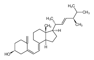 化学性质维生素D2又称麦角钙化甾醇是一种脂溶性固醇类衍生物。白色针状结晶或结晶性粉末,无臭,无味。,对光敏感。在高真空中(0.08Pa)升华而不分解。不被毛地黄皂苷沉淀(不同于麦角甾醇)。在任何情况下对光都敏感,在空气中数日就氧化。低温贮存则氧化缓慢。在丙二醇、玉米油或各种硝基苯甲酸酯中稳定。Mp115-118℃(分解),比旋光度[α]20D+102.5°(乙醇),本品乙醇液在265nm波长处有最大吸收。易溶于乙醇(1:2)、乙醚(1:2)、丙酮(1:10)和氯仿(1:0.7),不溶于水。遇氧或光照活性降低。密度:0.97 g/cm3,沸点:504.2ºC at 760 mmHg,熔点:114-118°C(lit.),闪点:218.2ºC,折射率:1.53,储存条件:2-8ºC