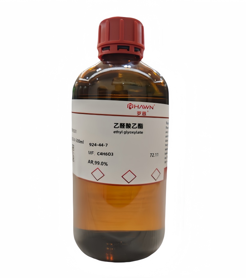 化学性质乙醛酸乙酯又称50%甲苯溶液是一种有机化合物,为透明无色至略黄色溶液,可溶于氯仿、乙酸乙酯,不溶于水,对密度:1.03g/mLat 20°C沸点:110°C闪点:7°C折射率:1.4750,常温,有害。易燃,需避免空气接触,储存需冷藏