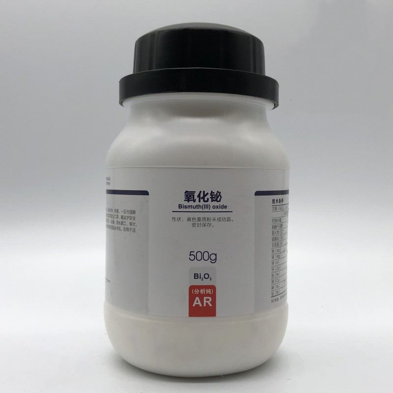 氧化铋又称三氧化二铋是一种无机化合物,是铋最重要的化合物之一,黄色重质粉末或单斜结晶。由硝酸铋加热分解制得。无气味。在空气中稳定。溶于盐酸和硝酸,不溶于水。加热变褐红色,冷后仍变黄色。相对密度8.5。熔点820℃。沸点1890℃。是铋最重要的化合物之一,可以被氢气还原为金属铋。虽然三氧化二铋可以从天然的铋华(一种矿物)取得,但是它主要的来源通常是炼铜或铅时的副产物,或直接燃烧铋(蓝色火焰)得到。