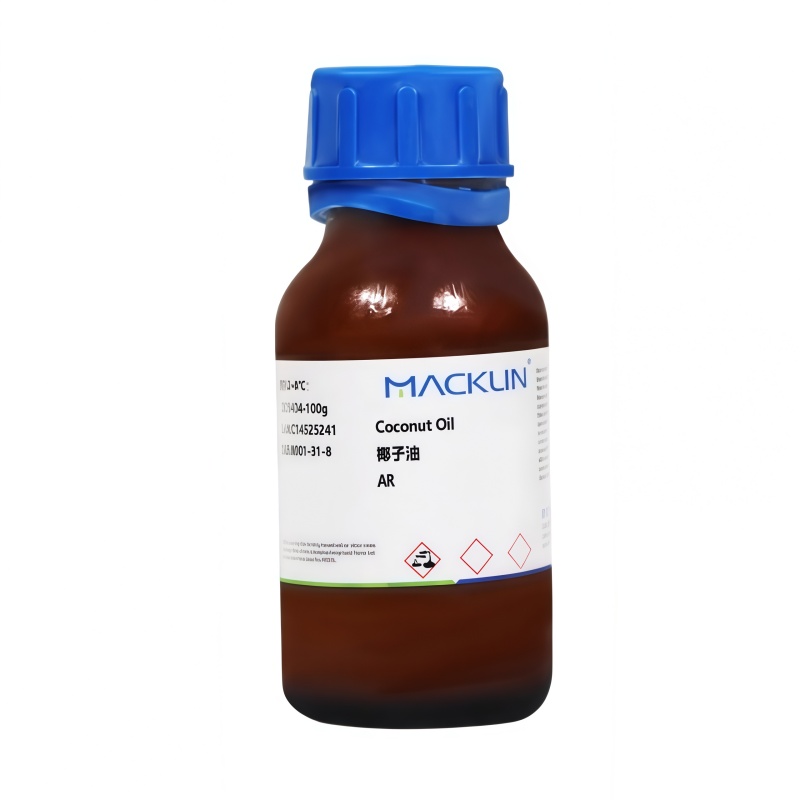 化学性质椰子油又称椰油是一种取自椰子果肉(干果肉含油约63%~70%)中的油),为白色至淡黄色半固体猪油样脂肪,有甜果仁香味。其组成为甘油三肉豆蔻酸酯、甘油三月桂酸酯、甘油三棕榈酸酯、甘油三硬脂酸酯及其他甘油酯。在空气中稳定,可条件下可保持几年不变。易溶于氯仿、乙醚、二氯甲烷、二硫化碳和石油醚,略溶于无水乙醇,几乎不溶于95%乙醇和水。熔点 21-27℃。密度 ρ(25)0.903g/mL。折光率 n40/D1.448-1.450。闪点 >235.4℉/>113℃,冷藏品-2-8℃,对环境无危害。稳定性:有甜果仁香味的油脂。有一突变熔程,从21℃或以下的几乎片块状可塑性固体至27℃时成为液体。