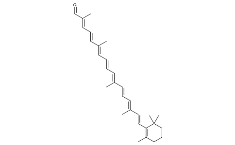 化学性质β-阿朴胡萝卜素醛又称全反式-β-阿林胡萝卜醛是一种含的类胡萝卜素氧化生成物之一,为带金属光泽的深紫色结晶或红紫色结晶性细粉,几乎无臭。天然品存在于柑橘皮(0.9~3.4mg,/kg)、橙汁(0.005~0.02mg/kg)等中。不溶于水,能分散于热水中,易溶于氯仿、难溶于乙醇,微溶于植物油,溶于丙酮、乙醚和环己烷,熔点 136-141℃。沸点 575.7℃/760mmHg。闪点 525.2℉/274℃,折射率:1.552,蒸汽压:2.95E-13mmHg at 25°C,冷藏品-2-8℃,灭火:雾状水、耐醇泡沫、砂土、干粉、二氧化碳。避免禁忌物。