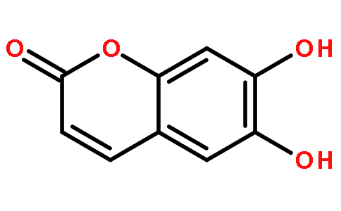 化学性质6,7-二羟基香豆素又称秦皮甲素是一种属香豆素类化合物,为黄色结晶粉末,无气味,味淡苦。真空中升华,冷凝后成叶状结晶。Λmax:344(MeOH)。溶于二甲亚砜、N,N-二甲基甲酰胺、丙酮、热乙醇、冰乙酸和稀碱溶液,微溶于水、乙醇和乙酸乙酯,不溶于乙醚和氯仿,密度:1.563 g/cm3,沸点:469.7ºC at 760 mmHg,熔点:271-273°C(lit.),闪点:201.4ºC,折射率:1.594,常温,具刺激性。