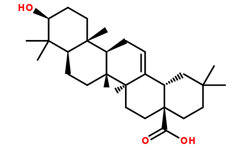 化学性质齐墩果酸又称土当归酸是一种从龙胆科植物獐牙菜属的青叶胆全草或女贞子的果实中分离提取而得一种五环三萜类化合物,为黄色结粉末,天然品来源于木犀科植物齐墩果 olea europaea l.的叶。溶于甲醇、乙醇、乙醚、丙酮和氯仿,不溶于水,密度:1.1 g/cm3,沸点:553.5ºC at 760 mmHg,熔点:>300°C(lit.),闪点:302.6ºC,折射率:1.557,比旋光 [α]20/D+76.5±2.5º(c=1,CHCl3),冷藏品-2-8℃,有害。