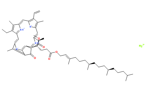 化学性质叶绿素 A是一种有机化合物,包含在浮游植物的多种色素中的重要色素,为蓝黑色蜡状粉末,对空气和光敏感。λmax:(乙醚)660、613、577、531、498、429、409nm。易溶于乙醚、乙醇、丙酮、氯仿、二硫化碳和苯,微溶于冷甲醇,几乎不溶于石油醚,不溶于水。其醇溶液为蓝绿色并显深红色荧光,沸点:1032.1ºC at 760mmHg,闪点:578ºC,蒸汽压:0mmHg at 25°C,比旋光 [α]20/D-262º(Acetone),冷藏品-2-8℃,对环境无危害。其分子结构由四个吡咯环形成卟啉环,中央结合镁原子,在酸性环境中可被置换为去镁叶绿素或与铜、锌结合形成稳定色素。