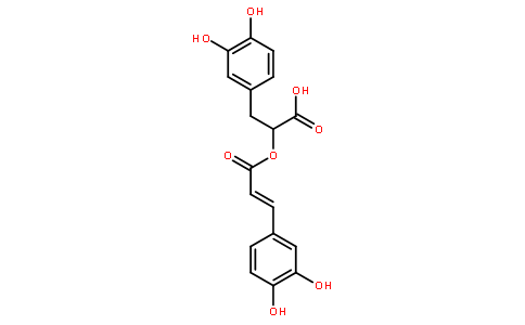 化学性质迷迭香酸又称迭香酸是一种从唇形科植物迷迭香中分离得到的一种水溶性的天然酚酸类化合物,为水溶性物质,为淡红色粉末,对空气敏感。溶于水、乙醇、二甲亚砜和N,N-二甲基甲酰胺,易吸潮,密度:1.33,沸点:694.7ºC at 760 mmHg,熔点:171-175°C(lit.),闪点:254.5ºC,折射率:1.713,蒸汽压:2.92E-20mmHg at 25°C,冷藏品-2-8℃,遇三氯化铁-铁氰化钾溶液显蓝绿色。