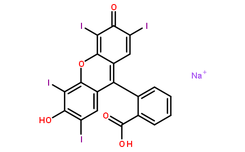 制备方法由荧光素碘化而得。将间苯二酚、苯酐和无水氯化锌加热熔融,得到粗制荧光素。粗品荧光素用乙醇精制后,溶解在氢氧化钠溶液中,再加碘进行反应。加入盐酸,析出结晶,然后将其转变成钠盐,浓缩即得。