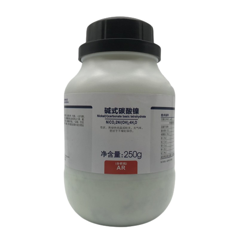 碱式碳酸镍是一种化学物质,亮绿色结晶或粉末。无气味。溶于氨水和稀酸并起泡,溶于水和碳酸钠溶液,与氨水和酸作用生成可溶性盐,溶于氨水、稀酸及碳酸铵、氰化钾、氯化钾的热溶液。在中温下用氢还原成细分散的有催化活性的金属镍。加热至300℃以上时分解成氧化镍和二氧化碳。相对密度约2.6。折光率1.56~1.61。半数致死量(豚鼠,皮下)32mg/kg。有致癌可能性。有刺激性。