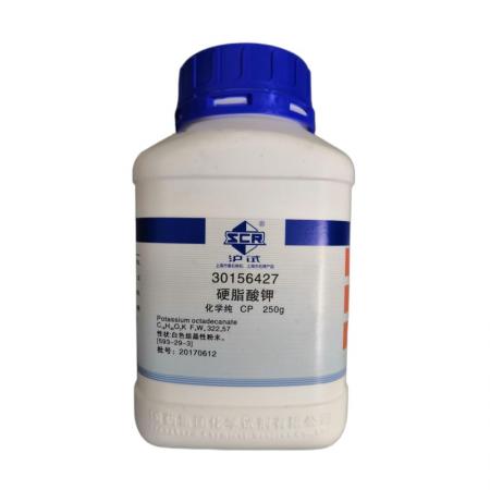 硬脂酸钾白色粉末。微有脂肪气味。易溶于热水或乙醇,缓溶于冷水,水溶液对石蕊和酚酞均呈强碱性,但乙醇溶液对酚酞仅呈微碱性。一般商品中含有相当比例的棕榈酸盐。