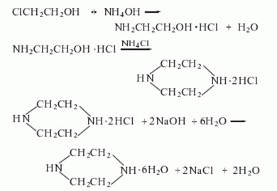 由氯乙醇经氨化、环合成哌嗪盐酸盐,再用氢氧化钠中和制得六水哌嗪,其反应式如下:
